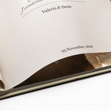 Книга оформляется с учётом всех пожеланий. Можно выбрать обложку с фотовставкой, металлической табличкой, фотоокном или сделать её абсолютно минималистичной. Возможно оформление с горячим тиснением, добавлением кальки, декоративных элементов — таких как уголки, бинты, подиумы. Это не нагромождение, а индивидуальные штрихи, которые собирают целостный образ.